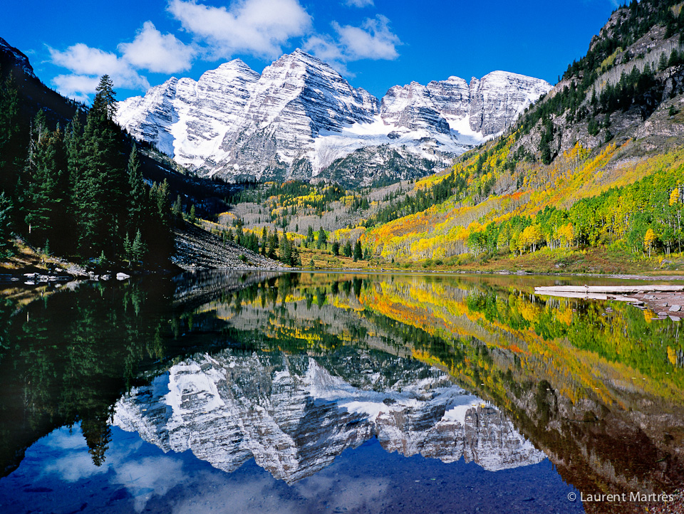 The Maroon Bells under a blanket of fresh snow with a perfect reflection in the lake. Maroon Bells Wilderness, CO