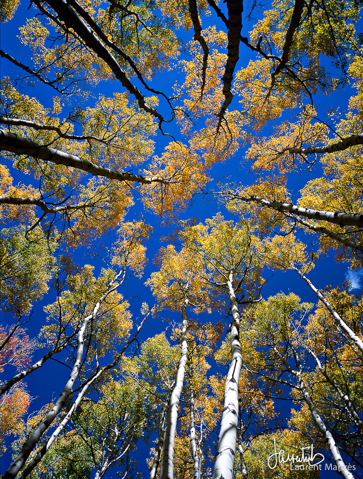 Aspens in full fall color regalia project their leaves toward the crisp Colorado sky. Last Dollar Road, CO