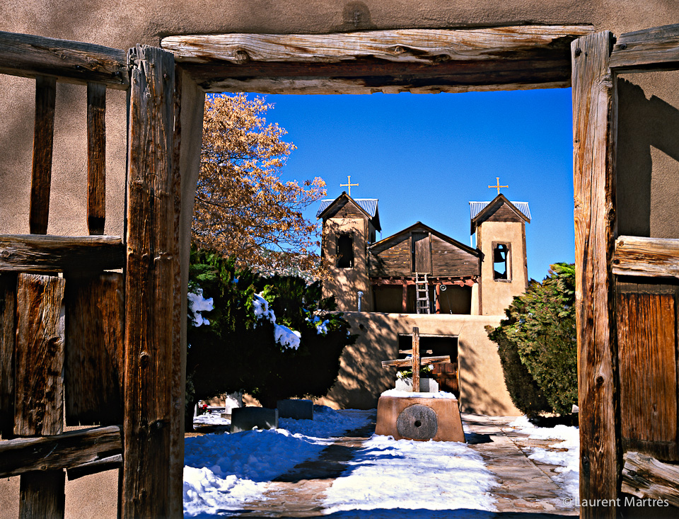 Soft winter light basks the lovely Santuario de chimayo, framed in its doorway. Chimayo, NM