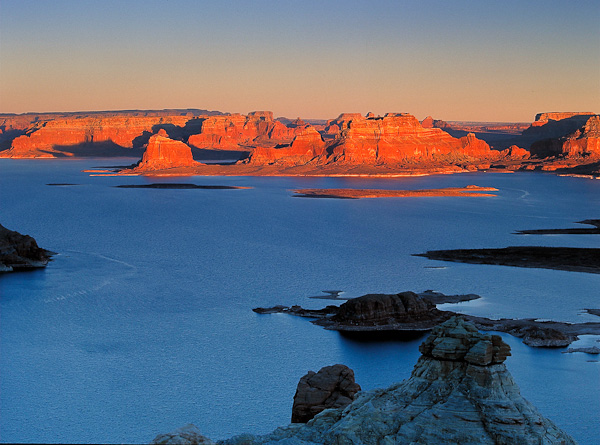 Last few seconds of sunset illuminate Dominguez Butte in fantastic red glow. Alstrom Point, UT