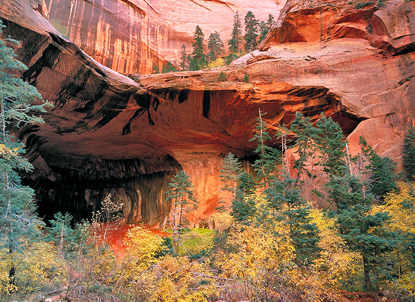 Mid-day reflected light casts a red glow on the alcoves of Taylor Canyon. Zion Nat'l Park, UT