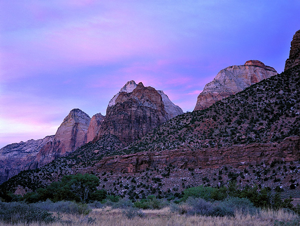Pastel alpenglow sets the sky ablaze 20 minutes after sunset. Zion Nat'l Park, UT
